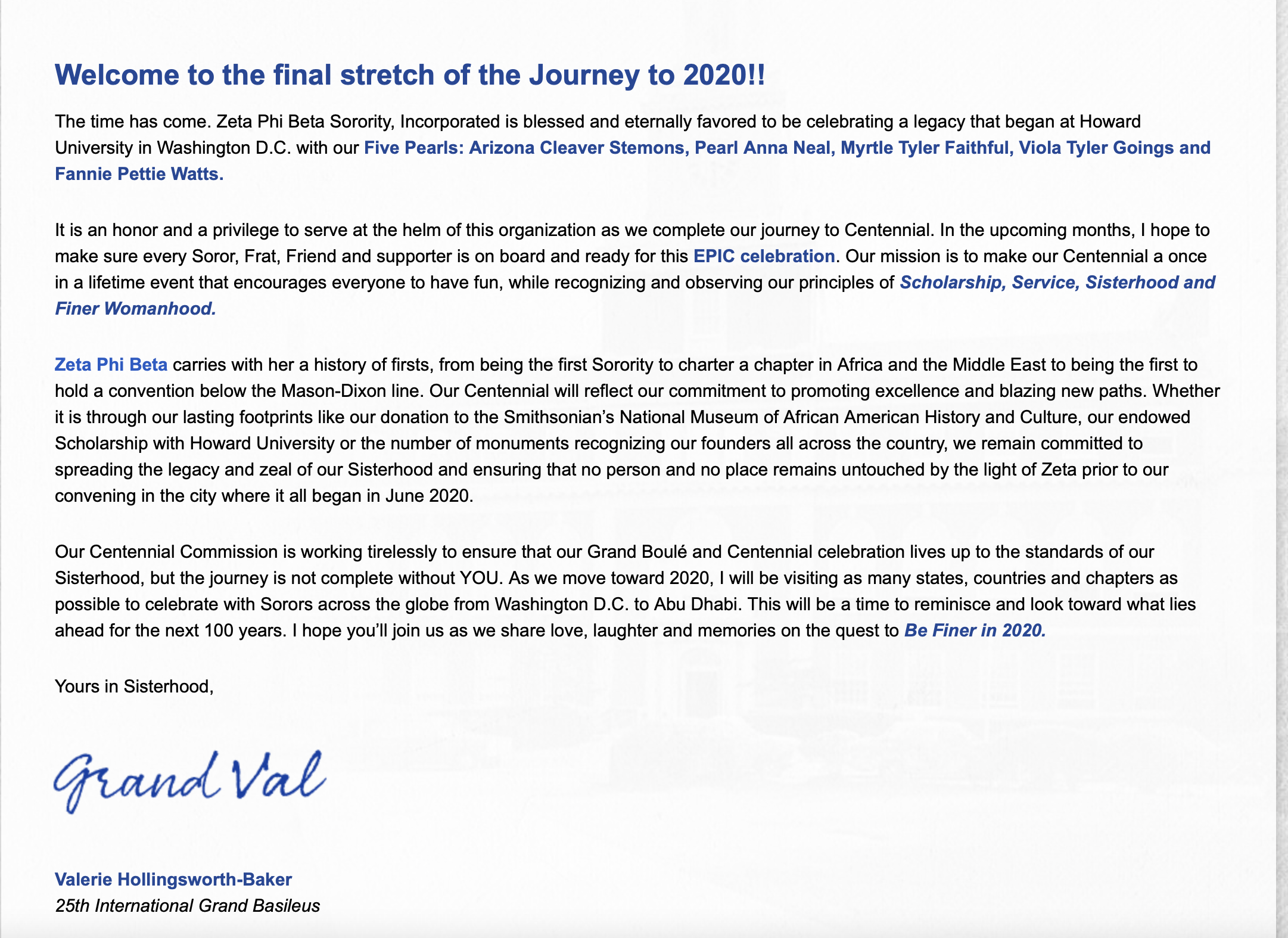 It was an honor to craft the official statement on behalf of Zeta Phi Beta Sorority, inc.’s international president. This statement, one of my many copywriting projects to promote the (then-upcoming) Sorority centennial, invited sorority members, fellow greeks and non-greek supporters to join Zeta Phi beta on the “journey to centennial” as we rounded out the final year before our celebration in 2020.